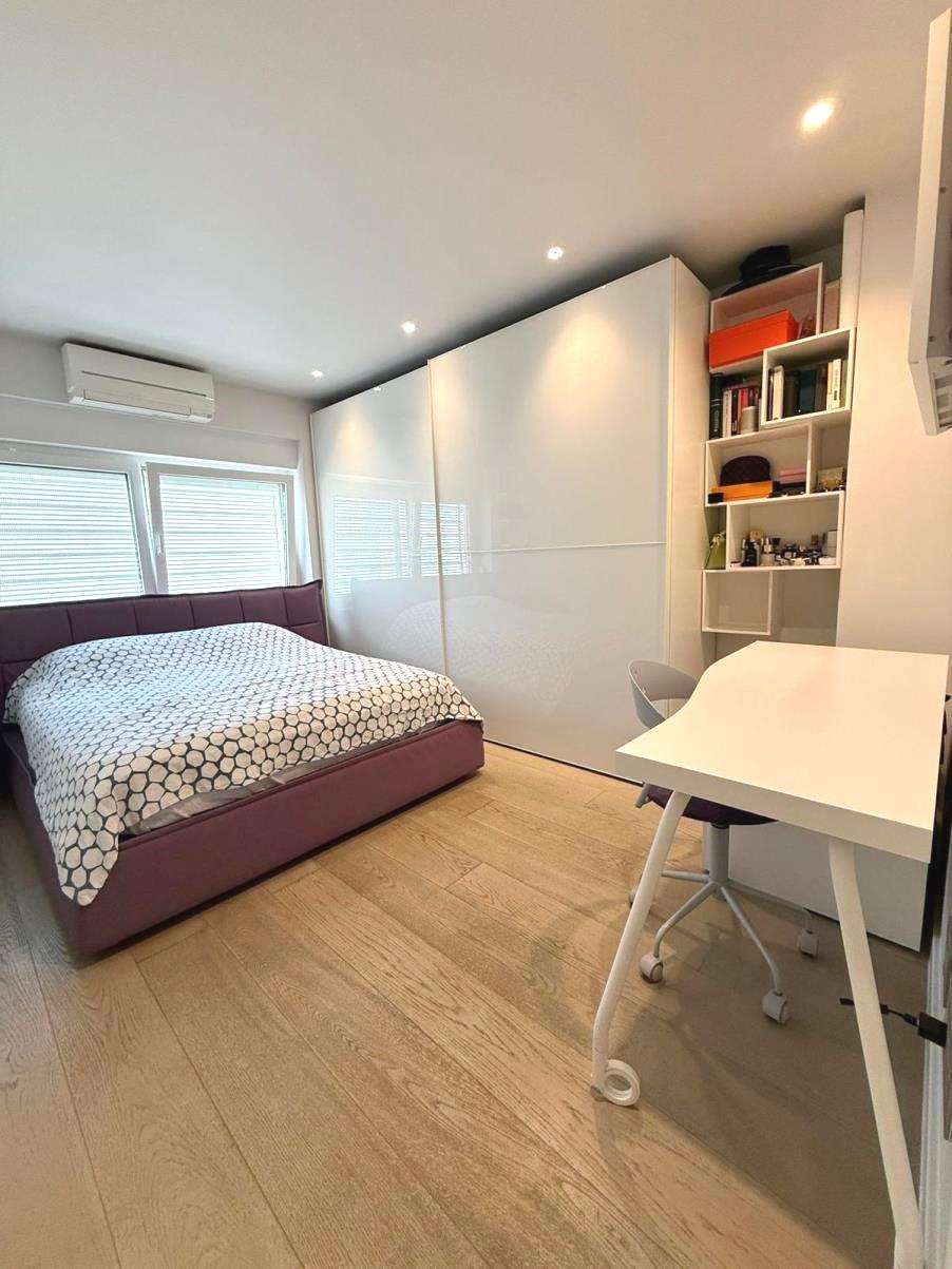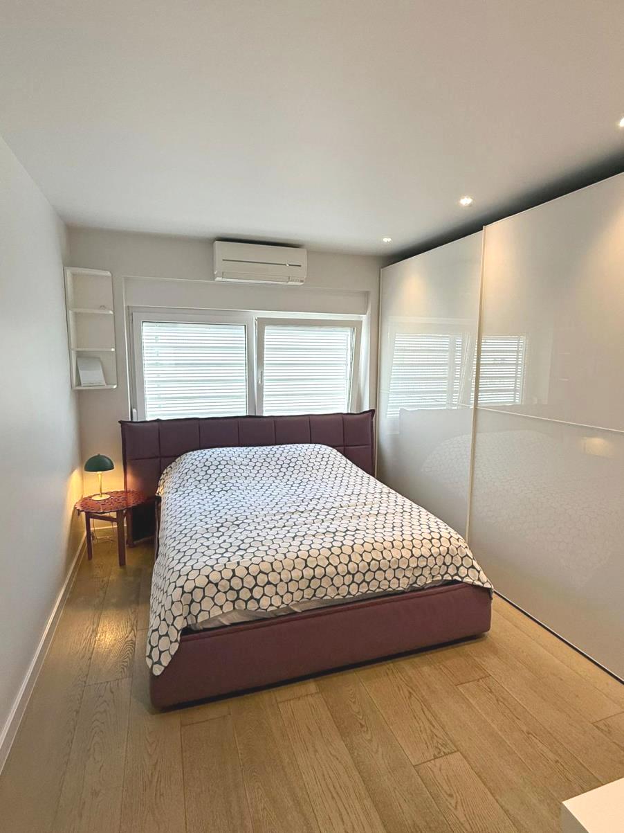 Stan ima dvije spavaće sobe, kuhinju, boravak blagovaonicu, kuponicu….spremište u podrumu – potpuno adaptiran, preuređen i opremljen dizajnerskim namještajem! Kupaonica sa kadom i walk-in tušem, potpuno opremljena kuhinja, ugradbeni ormari u cijelom stanu, prostrani dnevni boravak i blagovaonica, ugradbena rasvjeta…. U cijelom stanu je parket osim u kupaonici, grijanje/hlađenje klima uređajima u svakoj prostoriji, protuprovlna vrata, video portafon….