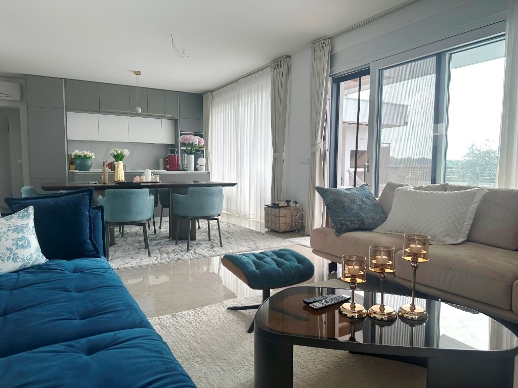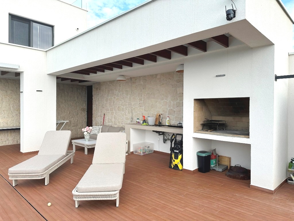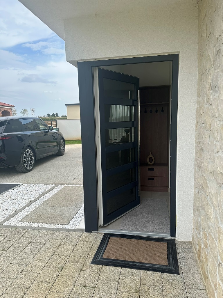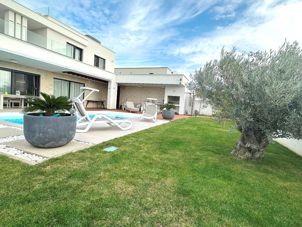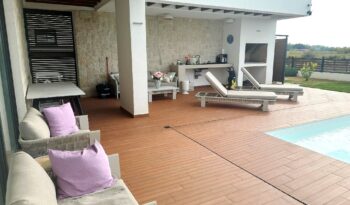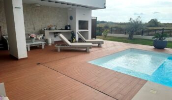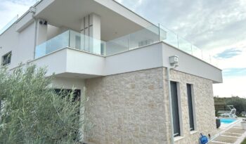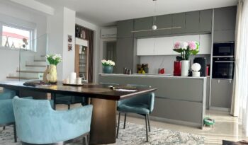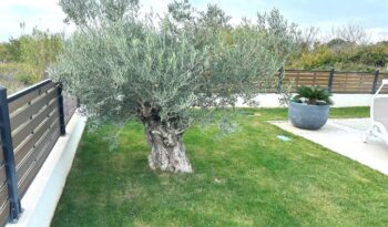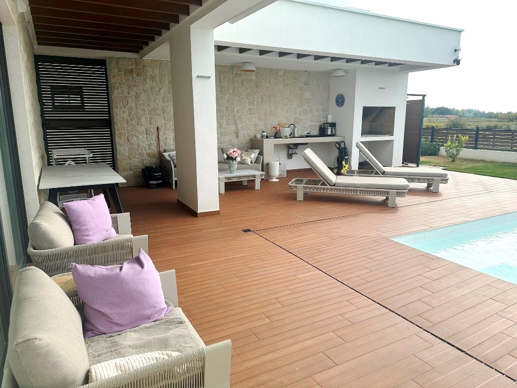 Kuća je u potpunosti namještena kvalitetnim namještajem, rađenim “po mjeri”. Kvalitetno izgrađena prije godinu dana, oprema kuće je na visokom nivou – velikoformatne talijanske pločice 1.klase u prizemlju, hrastov parket postavljen na “riblju kost” u sobama i na katu, sanitarije renomiranih proizvođača, podno grijanje cijele kuće, hlađenje dizalicom topline u svakoj prostoriji.