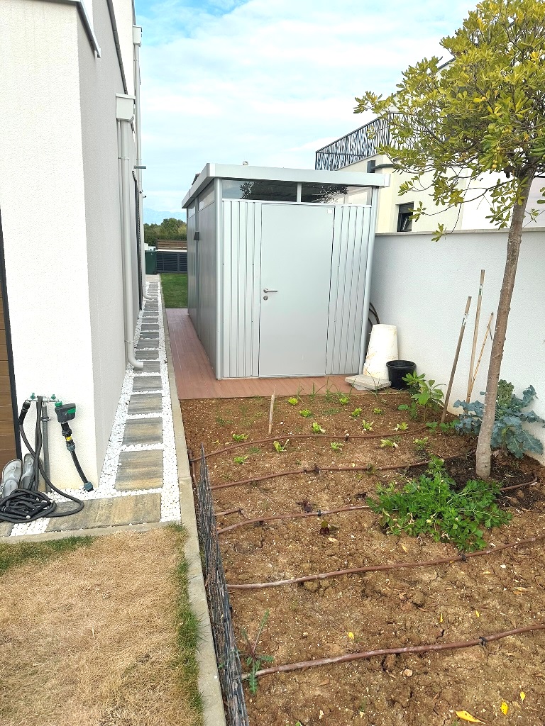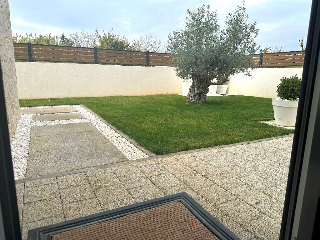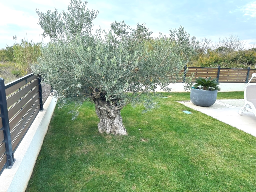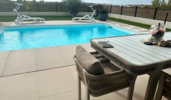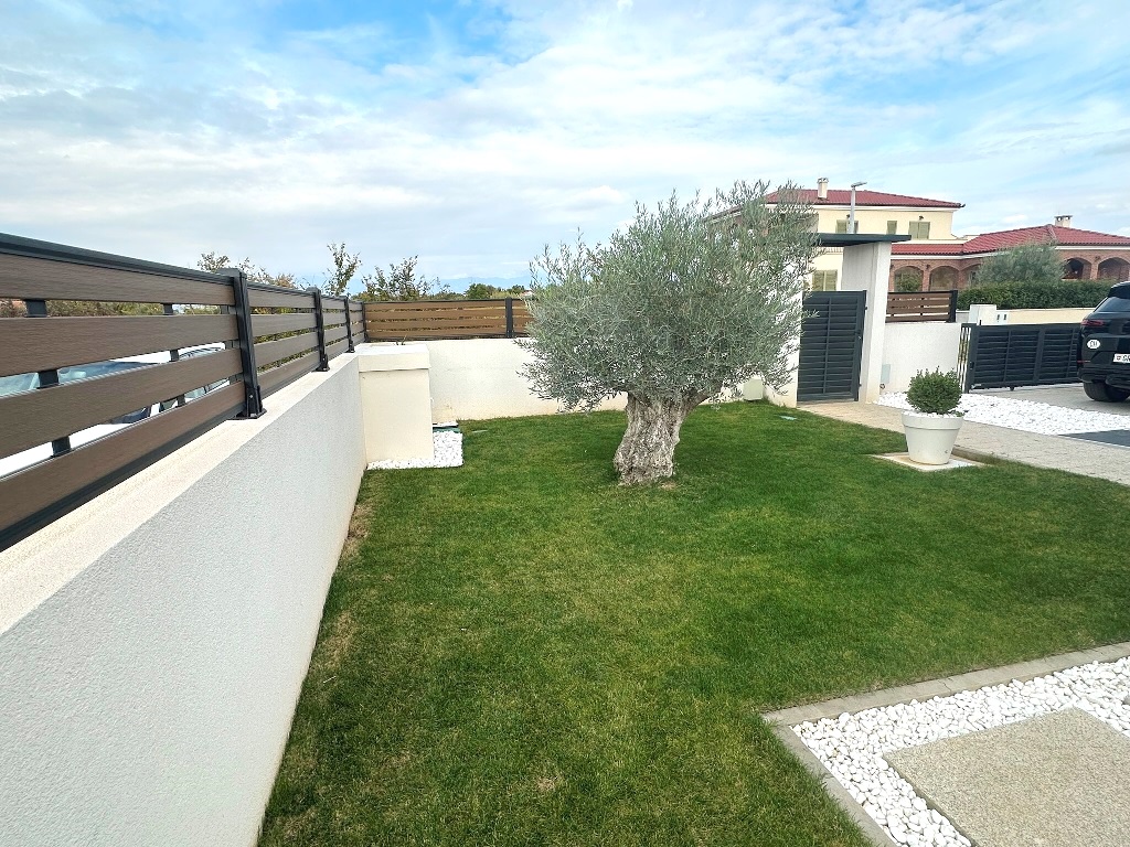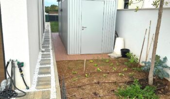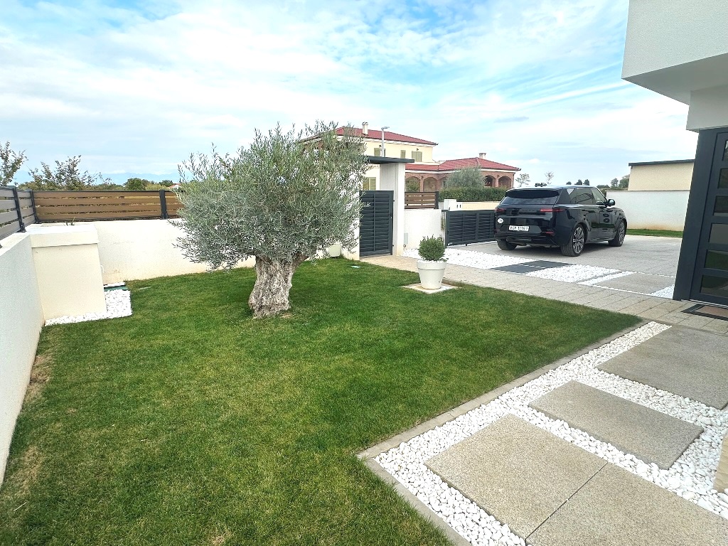 Kultivirana okućnica, travnjaci i zelenilo pod navodnjavanjem, grijani bazen površine 40m2, lijepo uređen vanjski komin i prostor uz bazen, vrtno spremište za alat. Parkiralište za tri automobila (punjač za el.vozila).