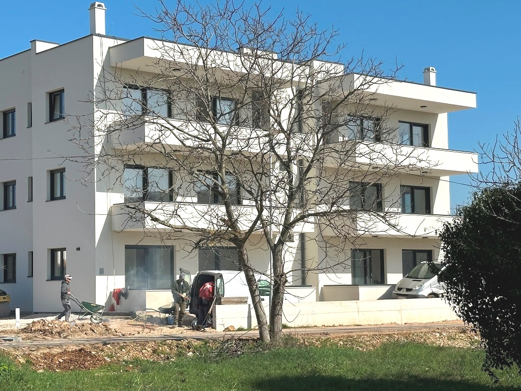 Zgrada se sastoji od 6 apartmana, po dva na svakoj etaži povezani centralnim stubištem. Kvalitetna izgradnja, AB konstrukcija, cigleni blok, termo fasada, alu stolarija….posebna pozornost posvećena završnim građevinskim radovima, visina stropova unutar apartmana 2,9m.