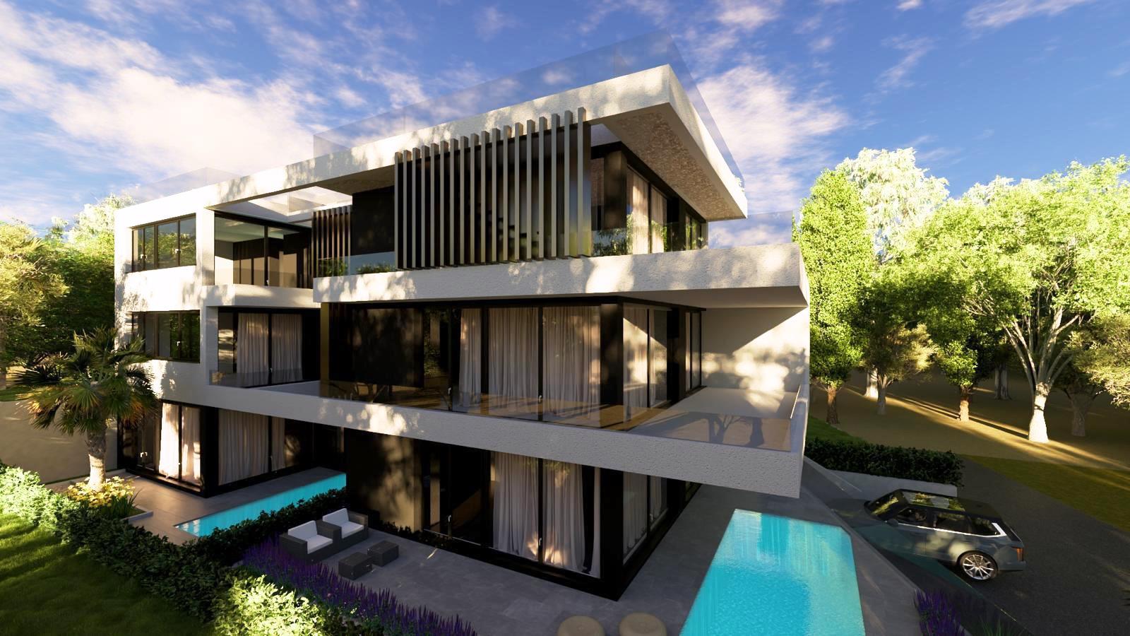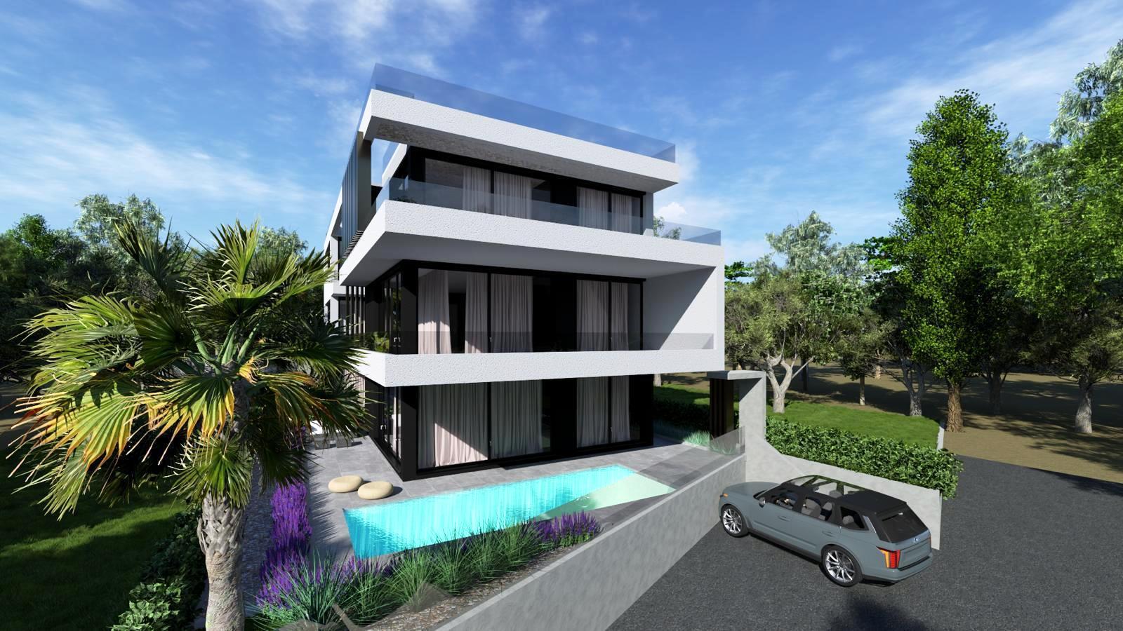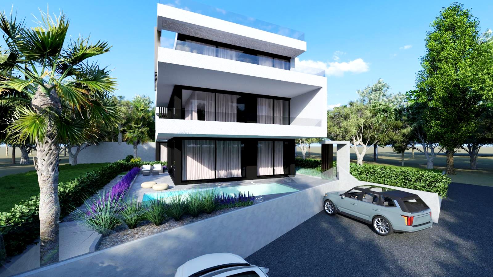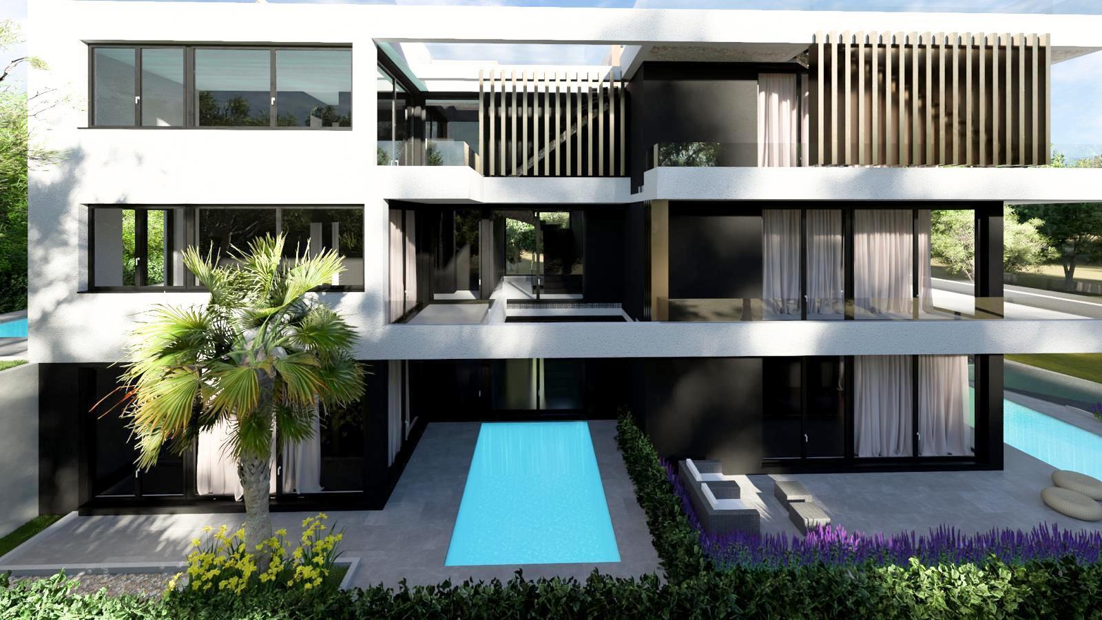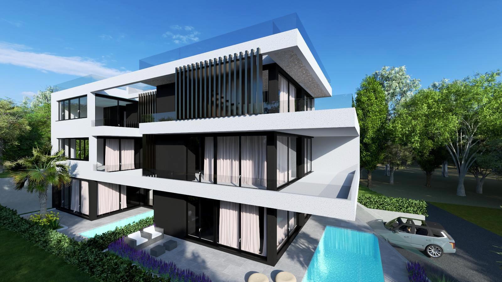 Projekt – luksuzan projekt se sastoji od šest stambenih jedinica, prizemlje+2 kata. Projektiranju objekta se pristupilo sa velikom pažnjom na privatnost, raspored prostorija i korištenje vanjskih privatnih dijelova zgrade, svi stanovi imaju terase koje pružaju prekrasan pogled na more i planinu Velebit koja izvire iz mora.  Svaka stambena jedinica sadrži posebnost poput privatnih bazena (5 stambenih jedinica), privatnih vrtova sa mediteranskim biljem (ružmarin, lavanda…te visokim palmama), penthouse stanovi  sa infinity bazenima na krovnoj terasi. Zajednička okućnica i parkirna mjesta imati će automatsku led rasvjetu, vidonadzor parkirnih mjesta i prilaza zgradi, svi ogradni zidovi okućnice biti će obloženi u bijeli prirodni kamen, staze u vrtovima i nenatkrivene terase popločane betonskim pločama 40*40cm.